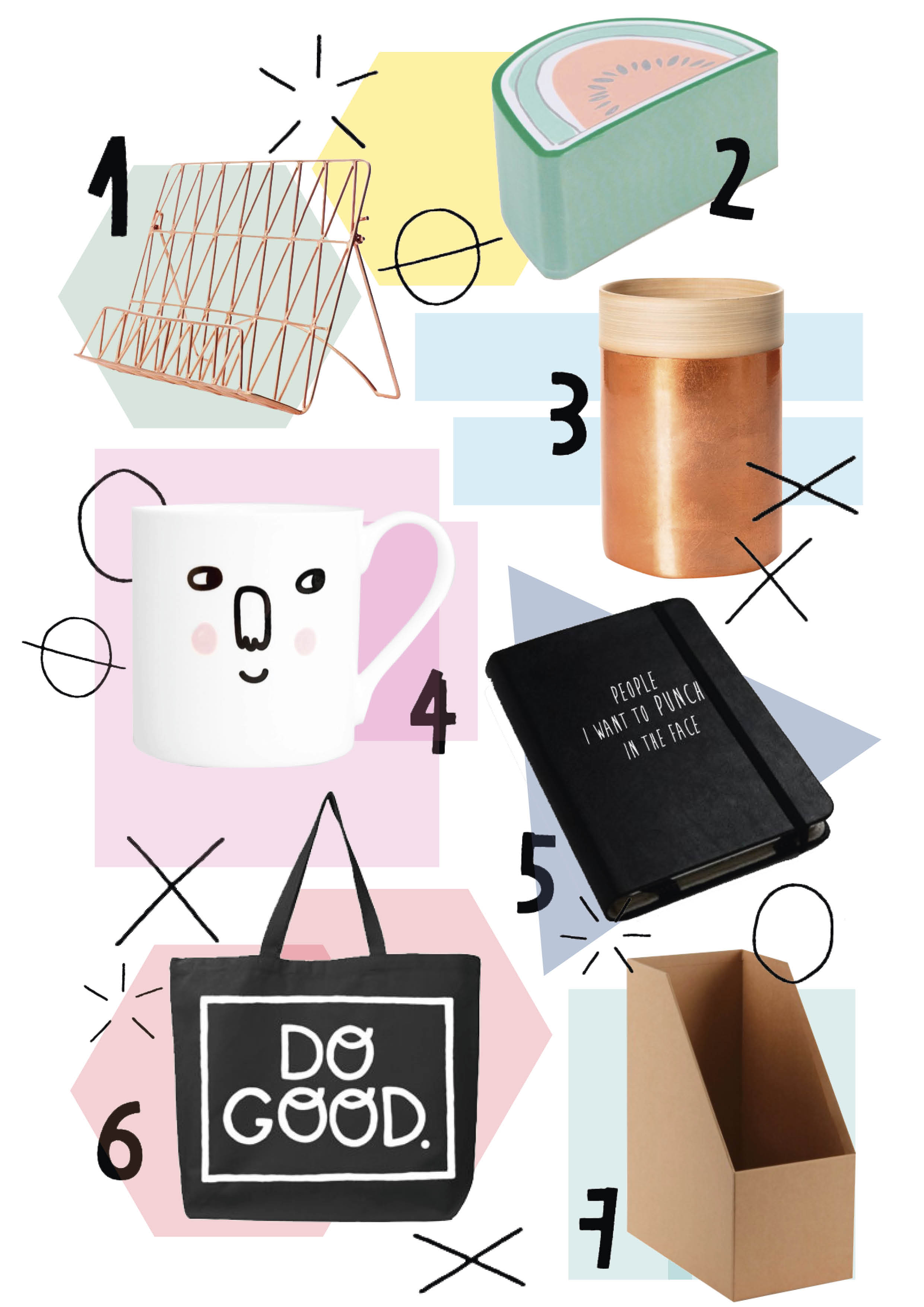 1. Copper Magazine Stand. Mmmm copper. I saw this and thought it would be handy to hold open any magazines I need for reference, or my notebook so I can check things off my to-do lists. // 2. This is the sweetest little watermelon note block, which my friend actually already bought me as a gift! // 3. Mmmm copper again! This time it’s a pencil pot, that would be of great use as I currently just stuff my many pens into an old mug. // 4. Talking of mugs, I do love a good one, and as a result of this we have way more than needed at home. This one would be kept at work though and I thought it was mega cute. // 5. ‘People I want to punch in the face’ notebook. Need I say more. Good for to do lists, and notes. As well as jotting down people’s names – as I always forget them! // 6. A big shopper bag, big enough to fit all my day-to-day bits in, including lunch and a bulging makeup bag. // 7. Sturdy ol’ magazine box file. They usually give you crappy flimsy ones in the office but this one I found looks like a beast and won’t fall a part at the amount of issues I’ll be squishing in to it!
