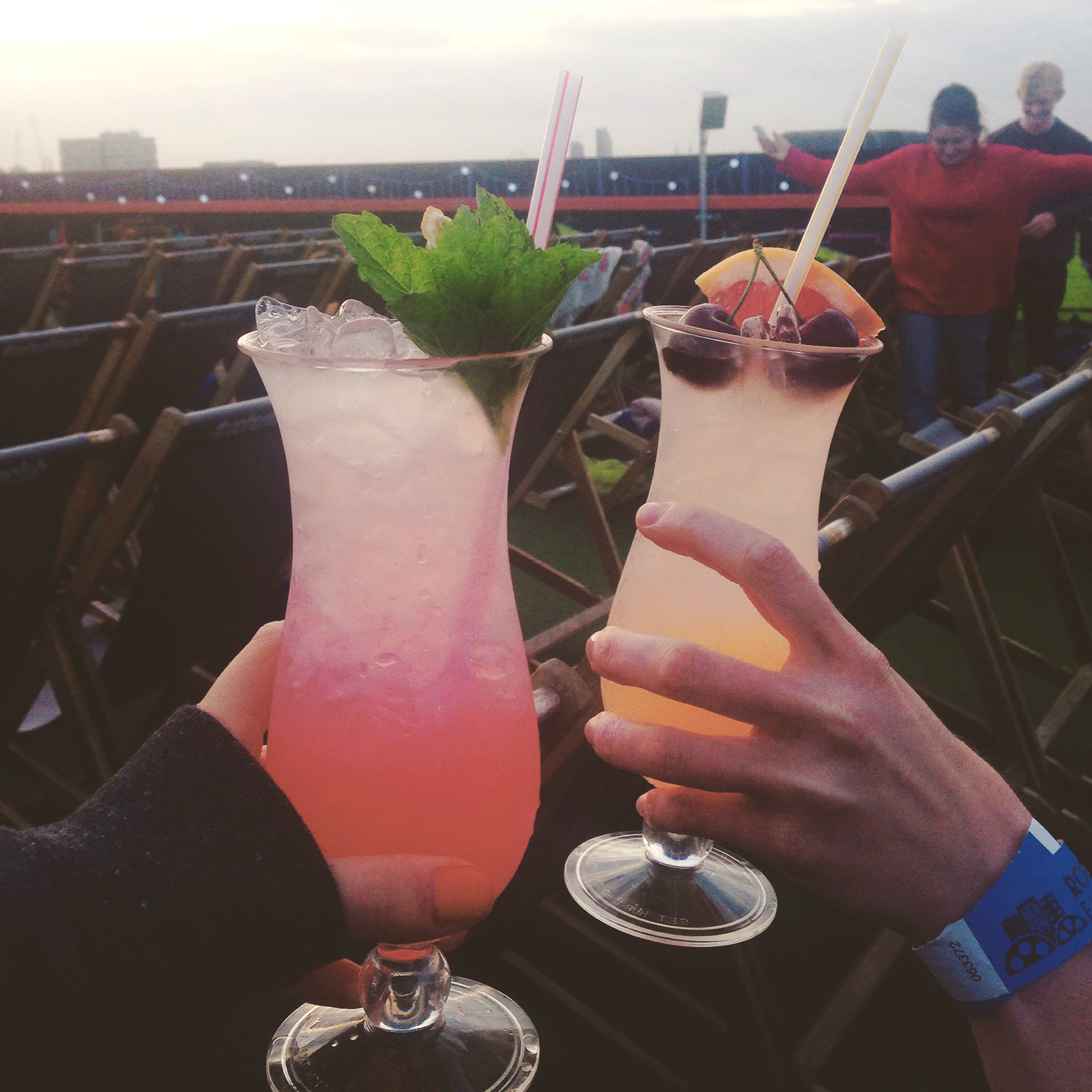 I’d never experienced ‘Pizza Pilgrims’ before but it is definitely high up there with my favourites now. It was quite hard to eat and drink on the roof as it was majorly windy up there, more than anything I was worried my wine would blow away! Nightmare. We finished up around 8pm and headed back to the other side to grab some good seats for the screening. Our new friend (aka the security guy) told us the best seats in the house were next to the second speaker on the left, nearest the wall – as to keep warm. Being the first to sit down, we nabbed the seats and then popped back to the bar to get a cheeky cocktail for while we waited. Everyone gets a blanket for during the screening but I would highly recommend taking a jumper or two as well, as it gets bloody cold once the sun goes down. My jumper and jacket were a life saver, as without them I would have probably frozen to death.