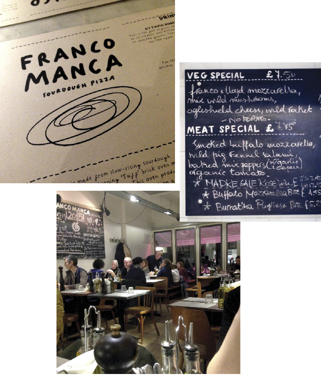 So onto dinner. Franco Manca is a sourdough pizza joint with locations all over London, which have a very small but tasty menu. Lucky for us there’s one in Southfields near us so we popped in on the way home. The restaurant is a short walk from the station and feels very homely but modern inside. I know sometimes when a place has a massive menu it can be a bit off putting as there’s too much choice, but with FM’s I kind of found the tiny menu had this effect on me. With no starters (only ‘specials’) there were only about six pizza’s to choose from, food wise. They don’t even do puddings! No pizza immidately stood out to me, but I went with one with ‘wild broccoli, mozzarella, gloucester old spot hand sliced sausage’, and asked for it to be on a tomato base, instead of the white pizza it was. I’m a serial offender for ordering off-menu, or asking things to be changed slightly with my food (meh) but the staff were more than happy to accommodate my diva demands..so that was good.