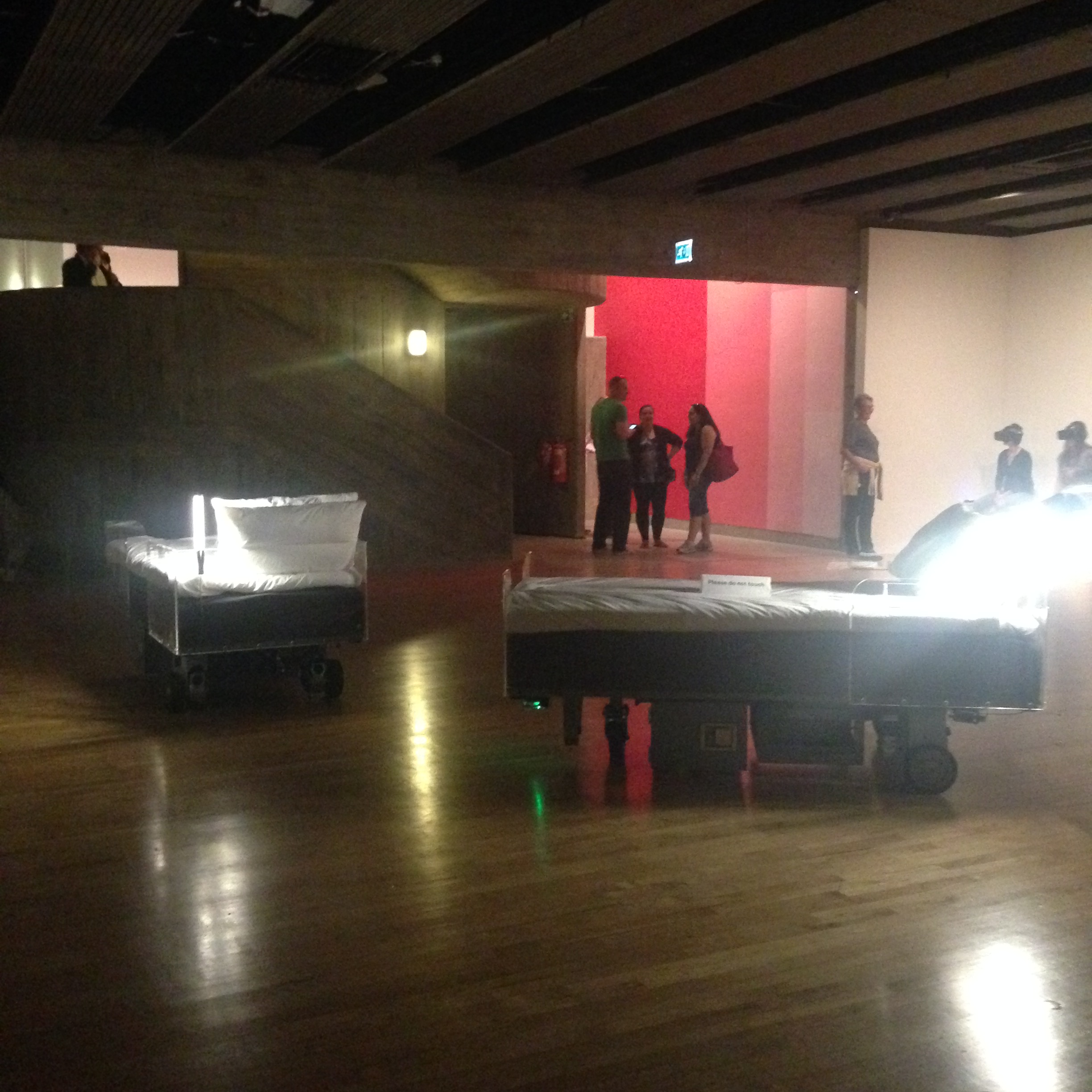 They really threw us in the deep end on our arrival of the exhibition. To get inside the gallery you first had to make your way through a tunnel made of sheet metal that was pitch black inside! You basically had to walk into this black void and hope for the best, not knowing which way to turn or what else was in there. Naturally I screamed the whole time we were in there (which B did not find endearing) and I was grabbing onto his arm rather tightly too! Once we finally made it out the other side and into the gallery, there were lots of bits and bobs to look at. I liked the ‘Pill Clock’, where tiny red and white pills fell from the ceiling every certain number of seconds, creating a mass of them on the ground. There were other odd experiences to be had such as a giant die for children to climb in and out of, as well as some hospital-looking beds roaming independently around a room.