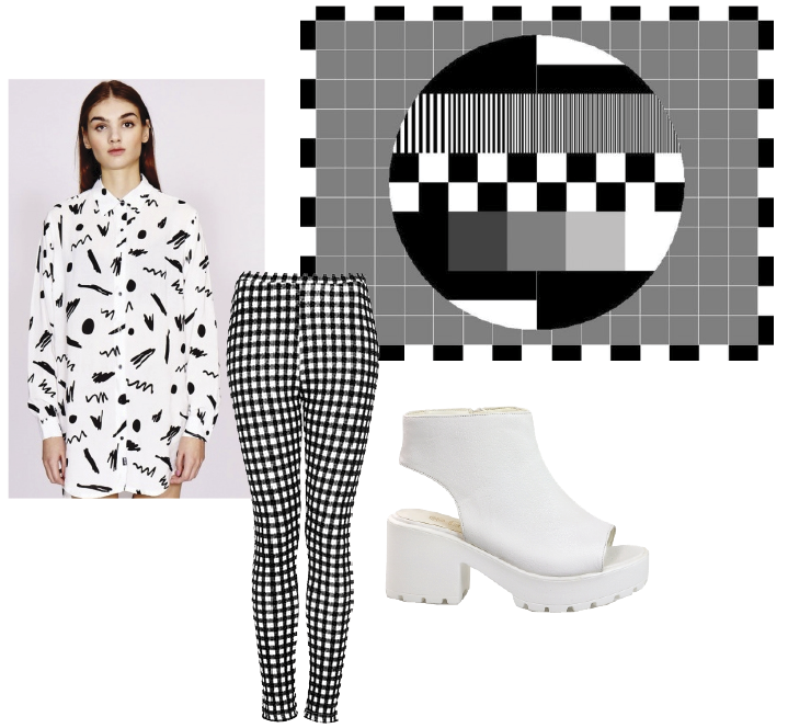 Jeremy Scott showed some test card inspired designs on the runway last year (above), and while they are quite literal, the idea of monochrome colour blocking teamed with black and white made me think about my own wardrobe. Maybe this test card I was so afraid of could actually inspire me to move away from the black and into the colour. I found some other test card-type designs that I like, and thought of how they would relate as outfits. If I’m honest the one I’m drawn to the most is the plain black and white one, but still.. maybe a pop of colour would do me good.